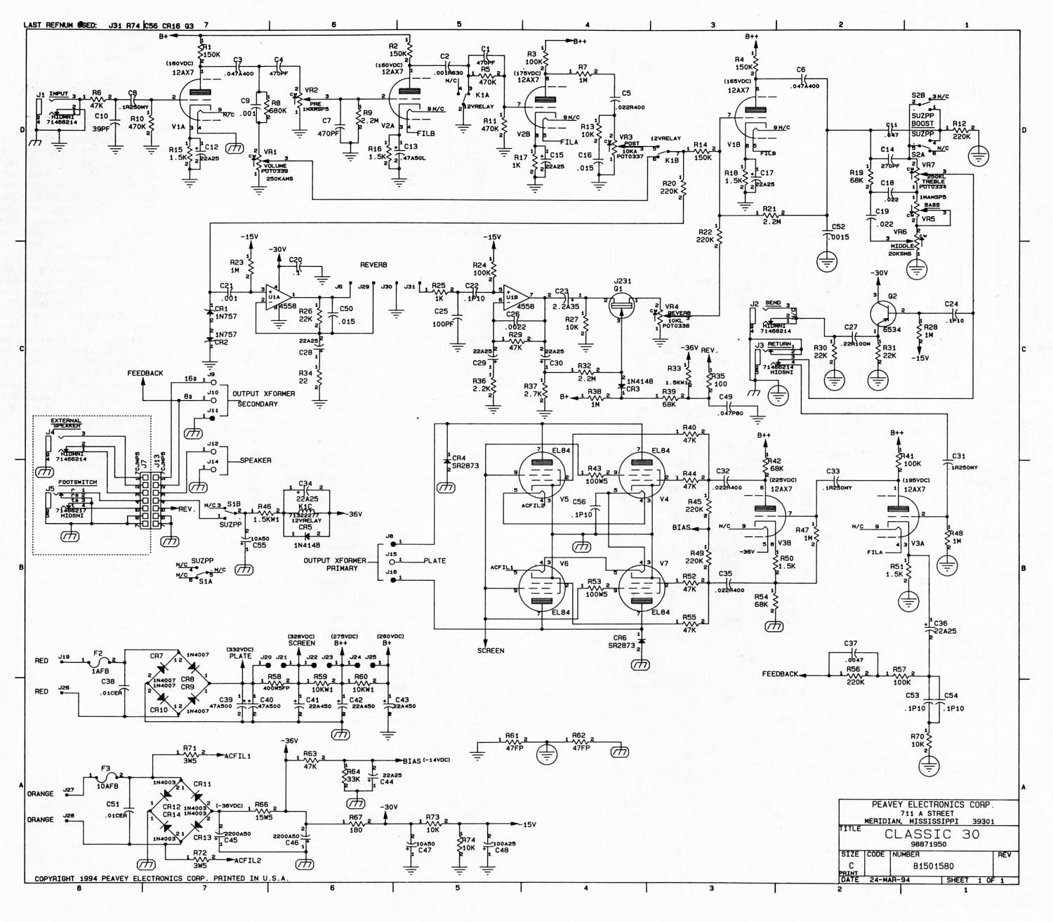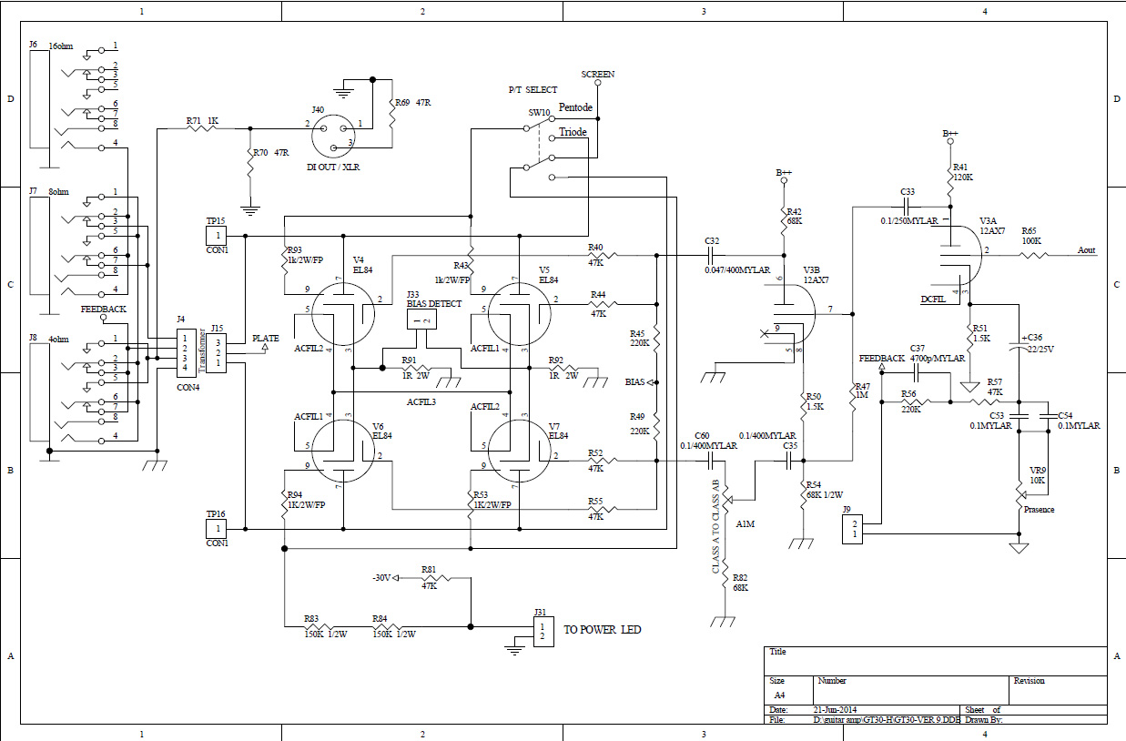 Jag mailade KLD om schema och fick svar efter ett par dagar!  Det jag som lekman ser direkt som skiljer sig från Peaveyn är: – Nån slags "gain boost" på ingången före rören. – Presence-kontroll i anslutning till ena fasvändarhalvans katod. – En (invändig?) pentod/triod-switch för slutsteget. – Nån trimpot A1M som det står "Class A to class AB" på, kopplad till ena slutrörsparets galler. – Mastervolym efter tonstack/effektloop men innan fasvändaren.