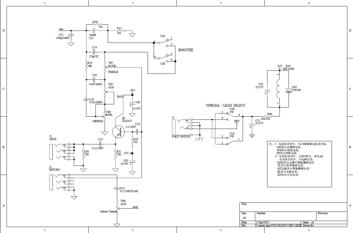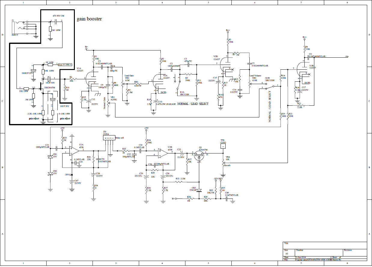 Om ingången är boostad mycket blir det lite för hög signal in i rörsteg 2 om man ställer leadgain högt enligt mina laborationer. Speciellt med den där mikroskopiska 620ohm gridstoppern. Det skulle kunna förklara "Maxar man gainen så blir det dessutom extremt diskantigt och låter "trasigt".