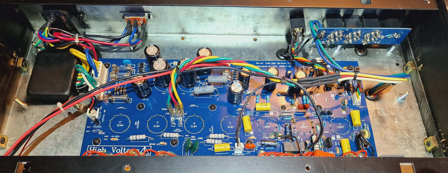Men, jag börjar undra om det knepiga ljudet i distkanalen inte är att röret V2 (som bara används i den kanalen) är kass. När man börjar närma sig full gain så ökar volymen plötsligt tokmycket och det blir nästan bara diskant, samt extremt hård och frasig klippning. Som om signalen plötsligt tar en annan väg som den inte borde. Kanske kunde vara nån konding som läcker eller nåt i och för sig. Det där "ploppet" när man byter kanal med master på fullt borde kunna säga nåt också, men osäker på vad.
